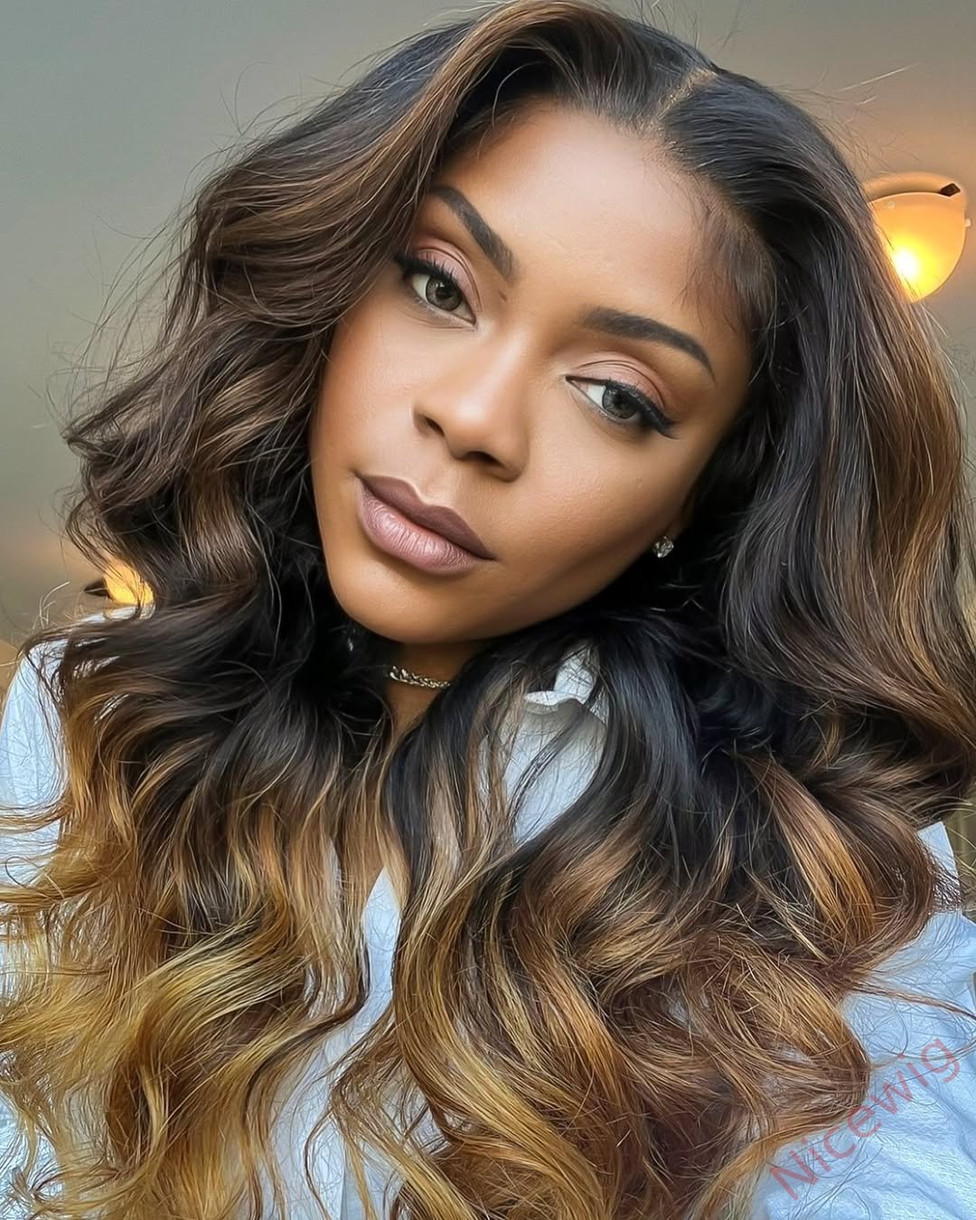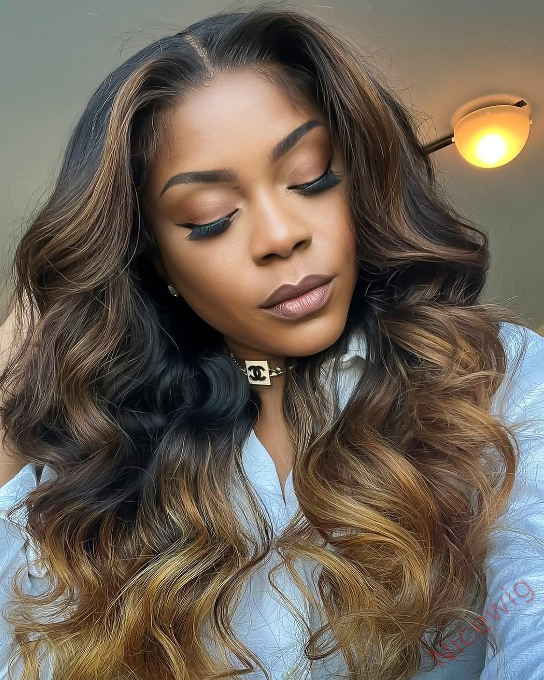 Brown Mixed Gold Highlights Loose Wave Glueless Long Wig