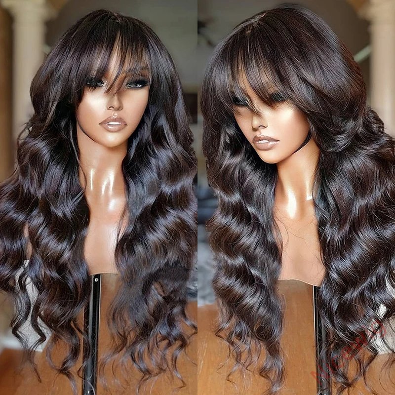 Glueless Black Long Hair Loose Deep Wave Wigs with Bangs