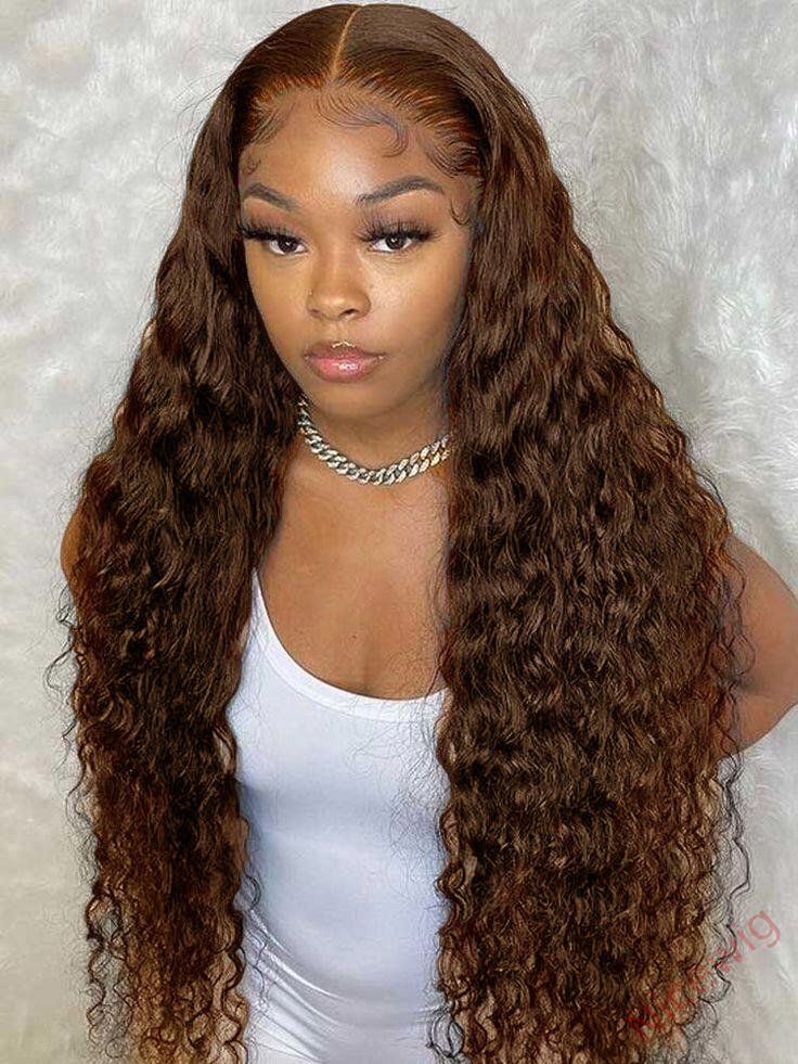 Glueless Dark Brown Brazilian Water Wave Long Curly Wigs