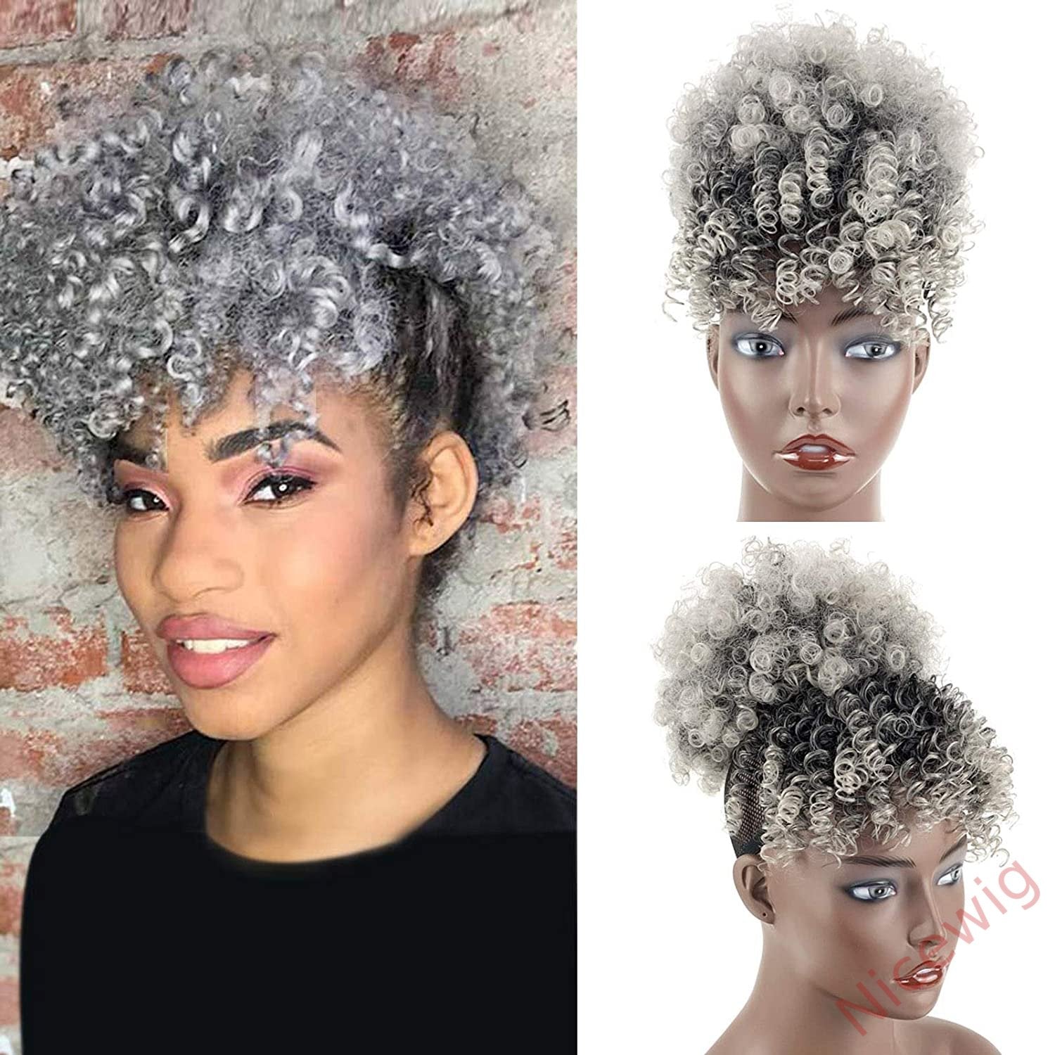 Gray Afro Puff Drawstring Ponytail with Bangs Wigs