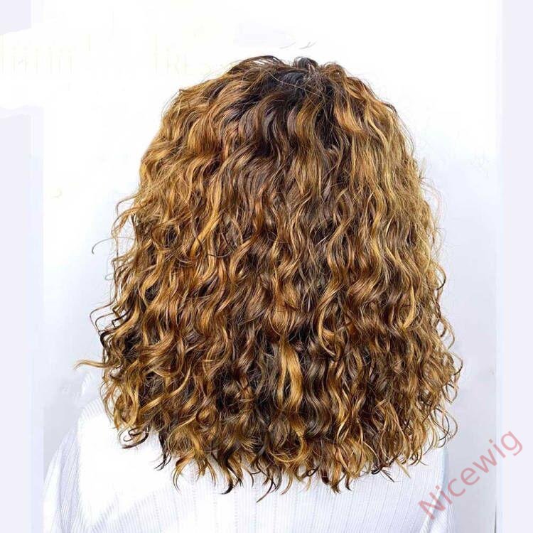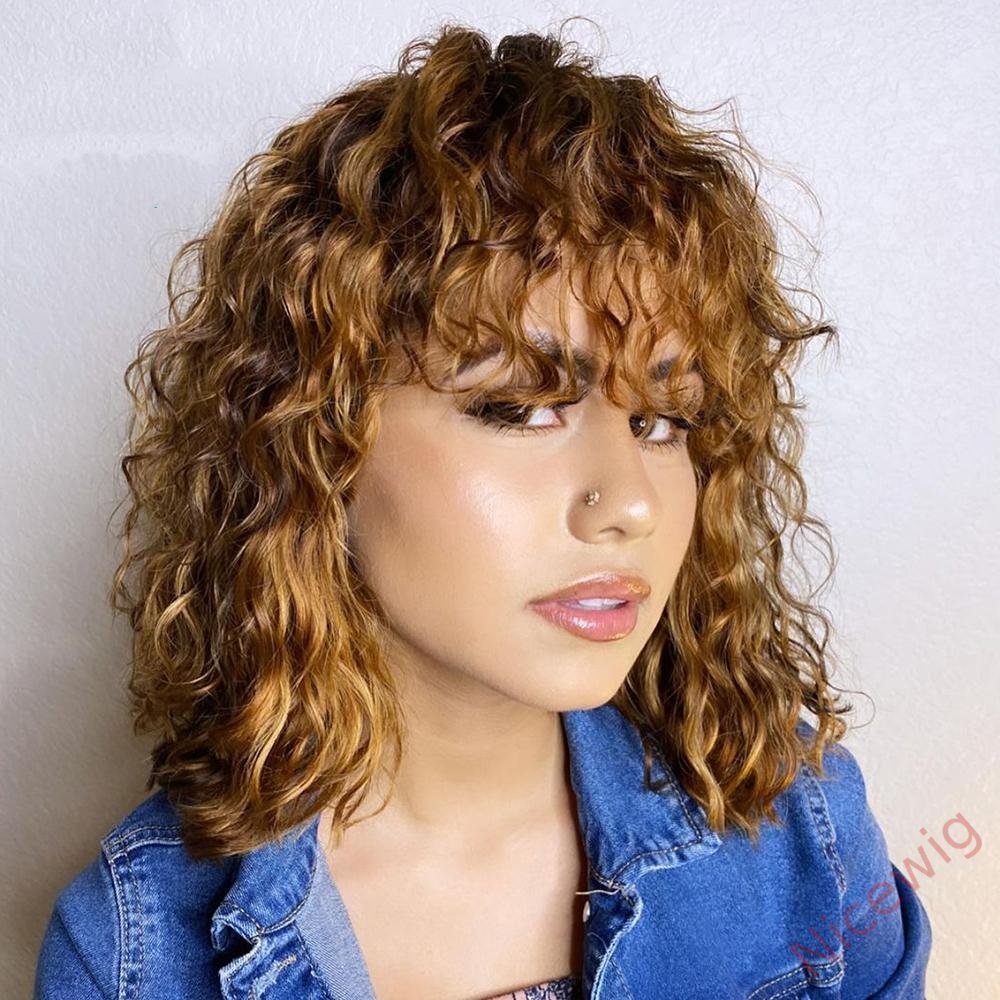 Light Brown/Black Color Brazilian Remy Curly Hair Wig With Bangs