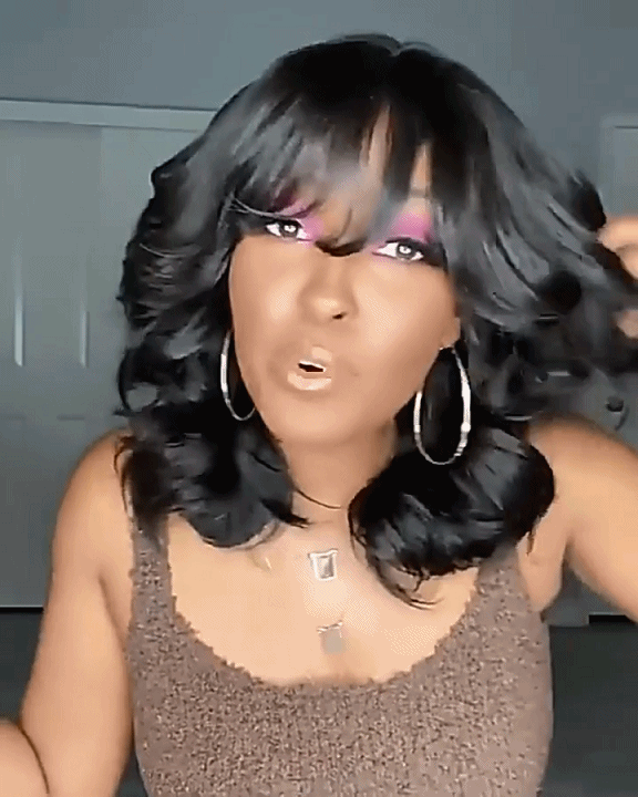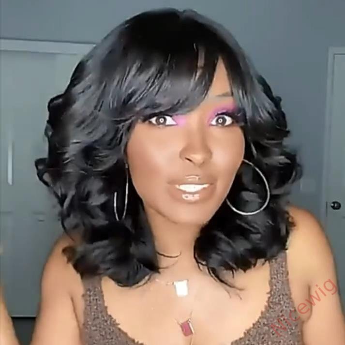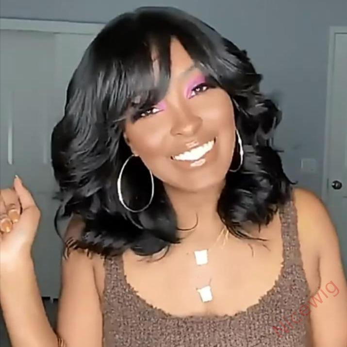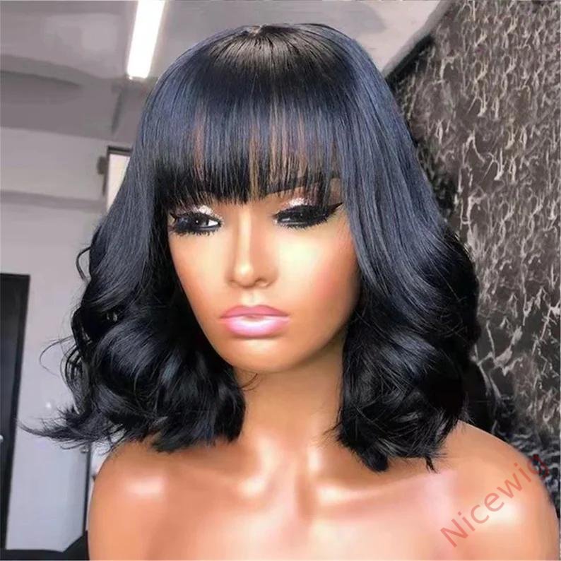 Natural Black Medium Hair Bob Body Wave Wig With Bangs
