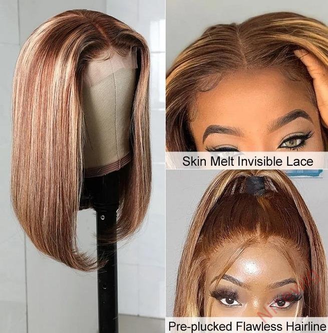 Straight Bob Wig Brown Mixed Blonde Highlights Wig